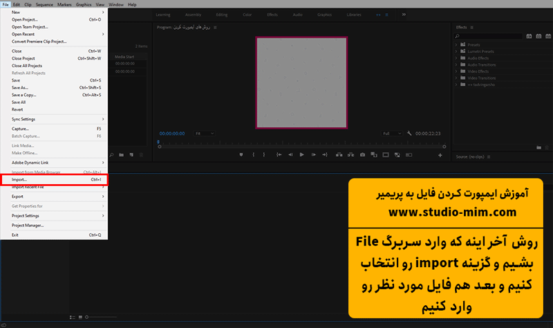 روش پنجم ایمپورت فایل در پریمیر اینه که وارد سربرگ file بشید و گزینه Import روانتخاب کنید و به آدرس مورد نظر برید و فایل رو انتخاب کنید و وارد نرم افزار پریمیر کنید.