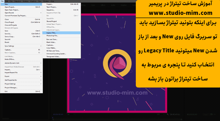 برای ساخت تیتراژ در پریمیر کافیه که به سربرگ File و بعد از اون New و در انتها به Legacy Title برید و اسم انتخاب کنید و یک تیتراژ جدید بسازید. نکته ی مهمی که حتما باید مد نظر داشته باشید اینه که در پریمیر نمیشه فارسی نوشت (همونطور که در مقاله ی نوشتن در پریمیر گفتیم ) باید در فارسی ساز متنتون رو بنویسید و بعد از تبدیل متنها رو در پریمیر Paste کنید.